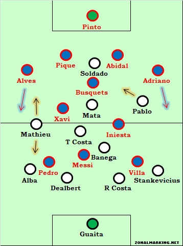 Ở đây vấn đề chủ chốt là mặc dù bộ đôi hậu vệ cánh Alves và Adriano bên phía Barca đã chơi lùi về sau, tuy nhiên họ vẫn có những pha dâng lên rất nguy hiểm ở 2 biên. Alves tiếp tục bị Mathieu đeo bám, nhưng Adriano thì vẫn được tự do hoạt động bên hành lang cánh trái, và cuối cùng thì anh cũng đã tạo ra được một cơ hội ngon ăn cho Messi băng vào dứt điểm hạ gục thủ thành Guaita mở tỉ số cho Barca ở phút thứ 77 của trận đấu.