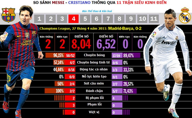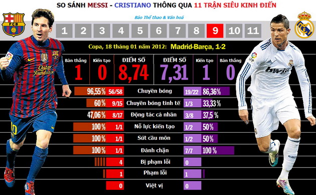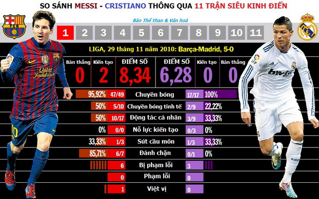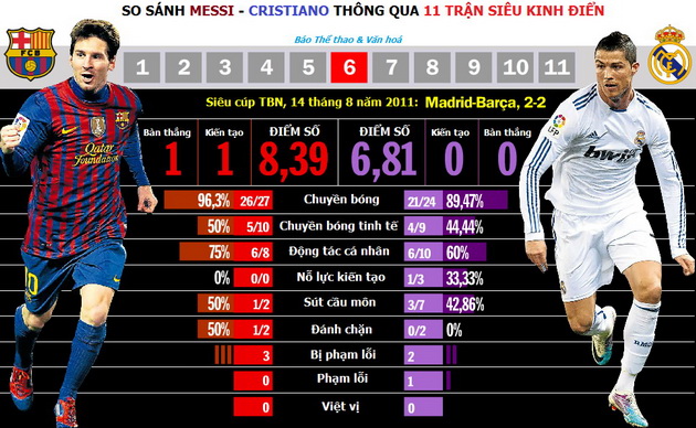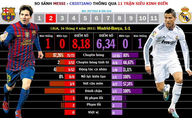 Theo đó, các kết quả nghiên cứu – thống kê của “VI” không chỉ trích dẫn, liệt kê con số bàn thắng và các đường kiến tạo thành bàn của Messi lẫn Cristiano trong 11 trận Siêu kinh điển (4 Liga, 4 Siêu cúp Tây Ban Nha, 2 Champions League và 1 Copa del Rey) mà còn so sánh cả 9 khái niệm thuộc phạm trù bóng đá: chuyền bóng, chuyền bóng tinh tế, động tác cá nhân, nỗ lực kiến tạo (đồng đội không thể hiện thực hoá bàn thắng), sút cầu môn, đánh chặn, bị phạm lỗi, phạm lỗi và việt vị.