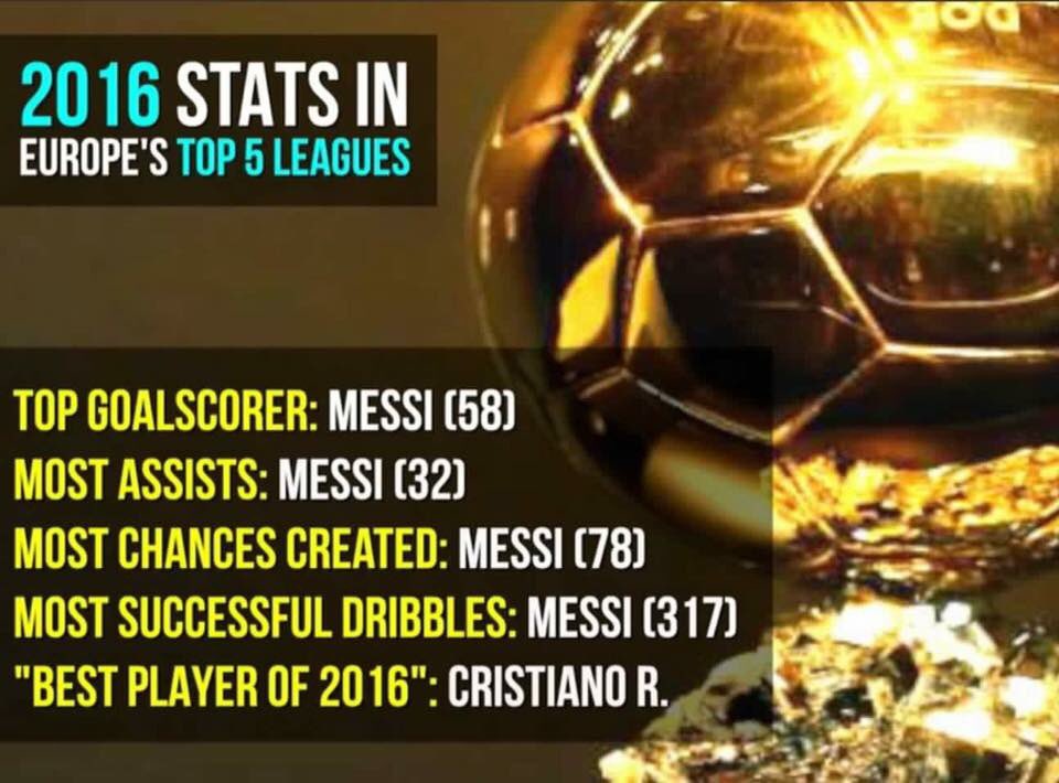 Nhưng phải nói rằng giải thưởng cá nhân đôi khi hơi nực cười. Nực cười ở chỗ đội bóng về thứ 2 thì coi như không được xét đến thành tích. Messi & Argentina rơi vào hoàn cảnh này, mặc dù vào được Chung kết World Cup 2014 là kỳ tích với Argentina khi đó. Hoặc Griezmann có phong độ tuyệt vời năm 2016, và thực sự xứng đáng hơn cả Ronaldo và Messi. Nhưng truyền thông có quyết định quá lớn trong các giải thưởng.