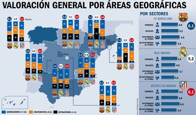 Về mặt địa lý, nghiên cứu đã cho ra những kết quả ấn tượng, ngay tại thủ độ Madrid, câu lạc bộ xứ Catalan cũng đạt sự ảnh hưởng đến 45% so với 53% của đội bóng áo trắng. Điều thú vị là những nghiên cứu về những người hay chỉ trích đội bóng, ở Madrid thì có 30% người hay chỉ trích, nói xấu Barça, và 21% người nói xấu Real.