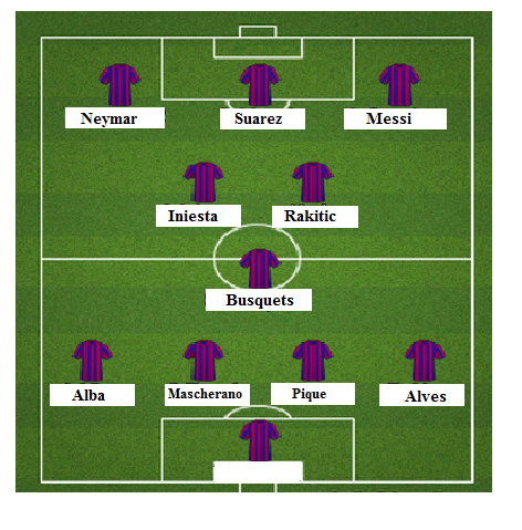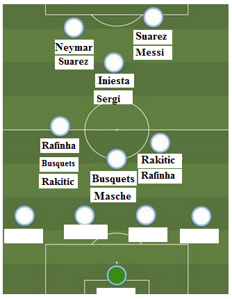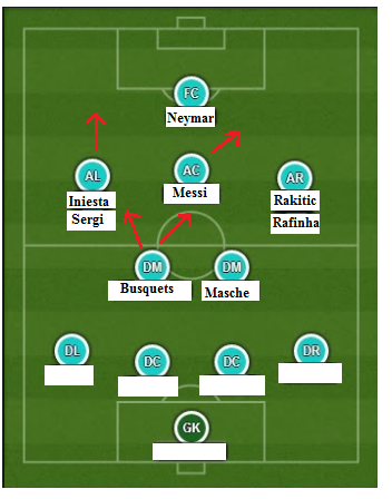 Chiến thuật trên sẽ ít có khả thi vì Iniesta là yếu tố không thể thiếu của Barca. Nhưng nếu chơi với 2 trong 3 số cầu thủ Nam Mỹ trên hàng công thì ta cũng có thế áp dụng đội hình trên.