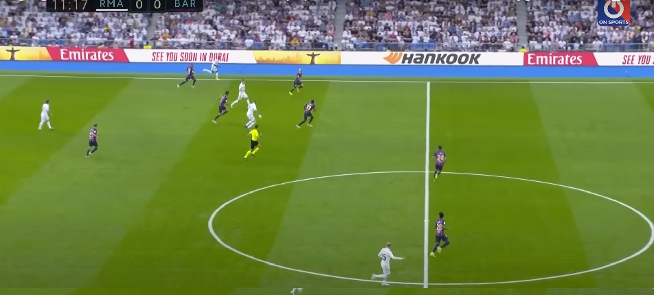 Chúng ta thấy De Jong đứng ở giữa sân, Busi đánh chặn ở cánh của Pedri. Eric Garcia theo kèm Benzema và xoạc bóng từ tận giữa sân. Ta đông hơn nhưng cú cứu bóng đường biên của đối phương đưa bóng vào khu vực 5 cầu thủ của chúng ta. Quá dễ để kết thúc đường bóng nhưng pha chạm đầu tai hại của Eric đưa bóng qua đầu Kounde đến chân Vinicius.