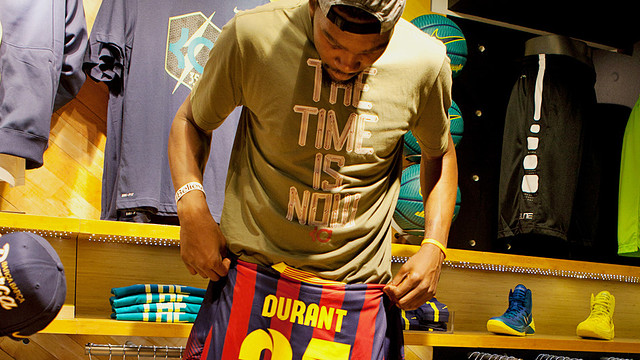 Kevin Durant, một trong những ngôi sao hàng đầu của giải đấu NBA, thành viên của đội Oklahoma City Thunder, vào hôm thứ Hai qua đã đến Barcelona du lịch. Tại Barcelona, trong một cửa hàng của Nike, vận động viên bóng rổ nổi tiếng này, người từng giành HCV Olympic London 2012 đã được đại diện CLB bóng đá FC Barcelona tặng một chiếc áo đấu mùa giải 2013/14 có tên anh trên đó cùng số áo 35.