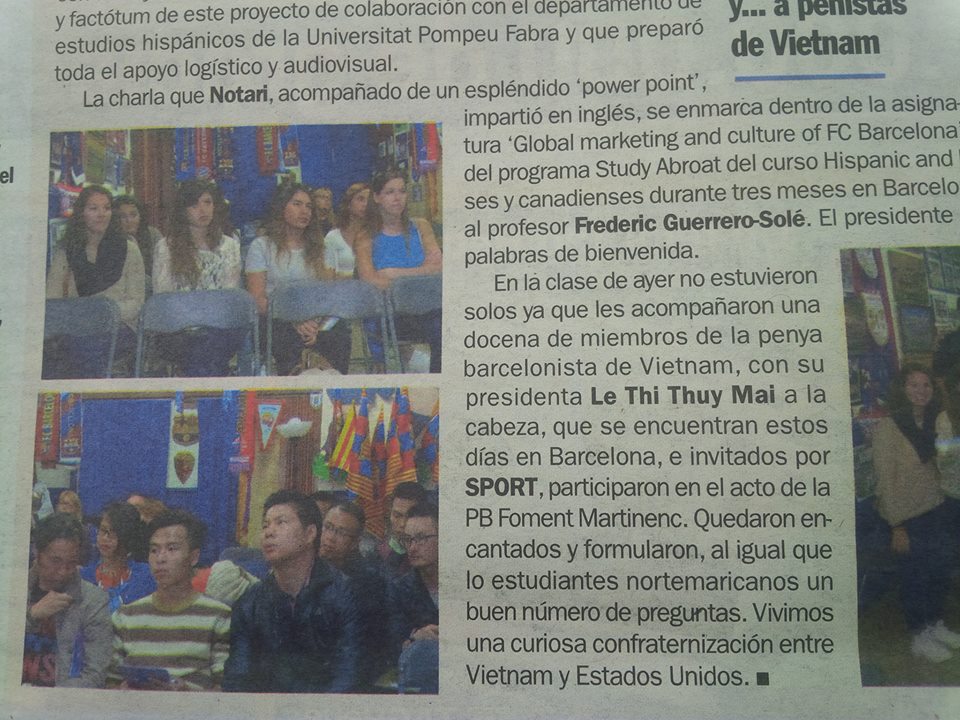 Bên cạnh đó, ngày 16 tháng 10, FCBVN đã vinh dự có buổi gặp gỡ tham quan tòa soạn báo Sport và thăm trụ sở của Penya lâu đời nhất thành phố Barcelona cùng với các Barçamania đến từ Mỹ. Thông tin của hoạt động này đã được báo Sport ghi lại trong số ra ngày hôm sau.