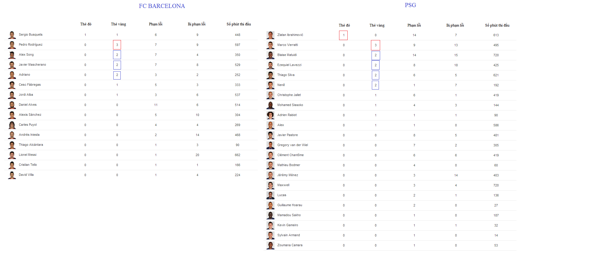 Ở trận tứ kết lượt đi thì bên phía PSG sẽ vắng mặt 2 cầu thủ là Ibrahimovic và tiền vệ Verratti, còn bên phía Barcelona là Pedro. Ngoài ra còn có một số cầu thủ nếu dính thêm thẻ vàng ở trận tiếp theo thì sẽ bị treo giò. Các cầu thủ nằm trong nguy cơ bị treo giò của chúng ta rất may là không có các cái tên hay đá chính. Còn bên PSG những cầu thủ đã dính 2 thẻ vàng đều là những cá nhân quan trọng và là trụ cột của đội.