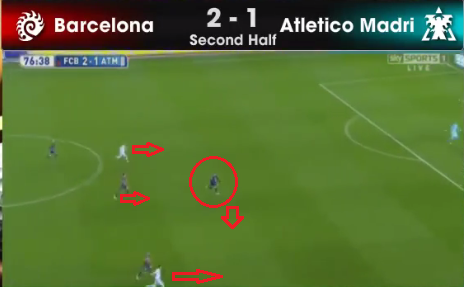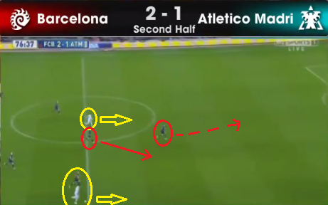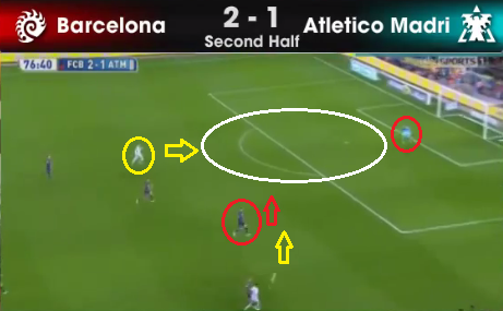 Bắt nguồn từ việc Messi bị vây và mất bóng trong vòng cấm địa ATM, bóng được phất qua cánh phải cho Mandzukic, Jordi Alba bất ngờ trượt ngã khiến anh mất đi một nhịp để theo đuổi số 9 đang đi sát biên. Đứng cuối cùng hàng thủ của Barca là Gerard Pique; Sergio Busquets thì đang gấp gáp chạy về nhưng tốc độ không cao và thua F. Torres đang lao xuống ở khu vực trung lộ một nhịp đáng kể; Mascherano thì gần như bị loại bỏ khỏi pha bóng này vì không thể can thiệp gì hơn.