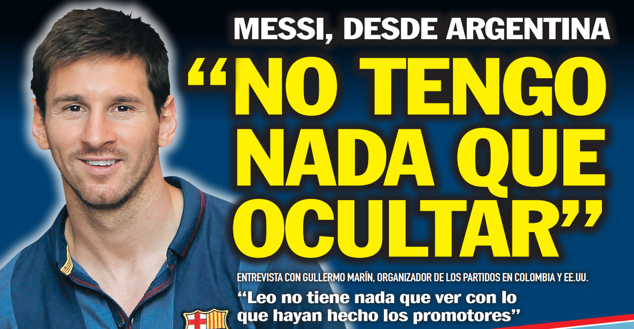 Trang nhất tờ SPORT (Barcelona) số ra hôm nay đăng tải phát biểu của một người thân cận Messi ở Argentina trước chiến dịch bôi bẩn thanh danh anh đang diễn ra trên quy mô toàn cầu: “Leo rất bình thản. Cậu ấy không có gì để phải che giấu cả.”