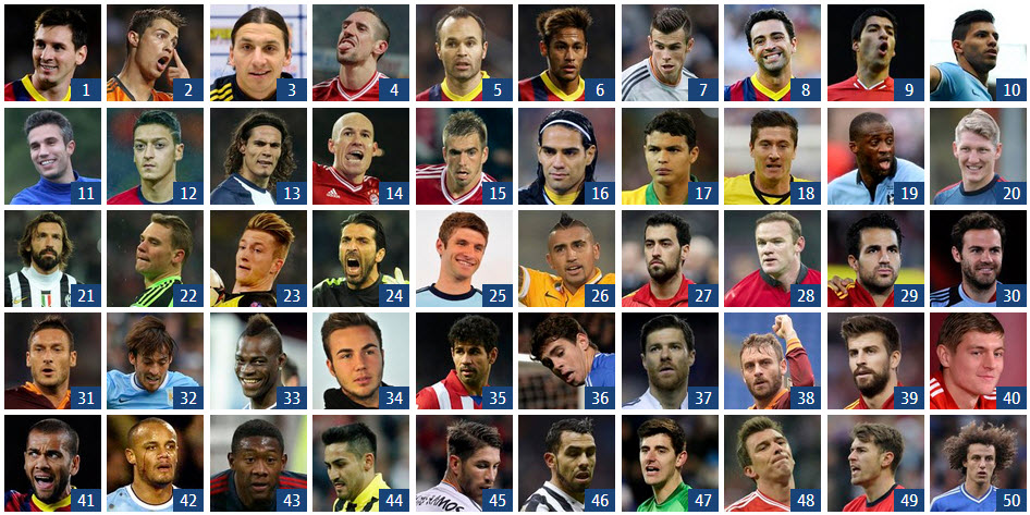 Không như 3 cái tên cuối cùng của danh hiệu QBV 2013, 3 vị trí đầu tiên của danh sách 100 từ Guardian không có mặt Franck Ribery. Thay vào đó, xếp sau Messi và Cristiano là Zlatan Ibrahimovic. Ribery chỉ xếp vị trí thứ 4.