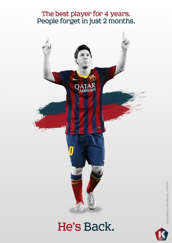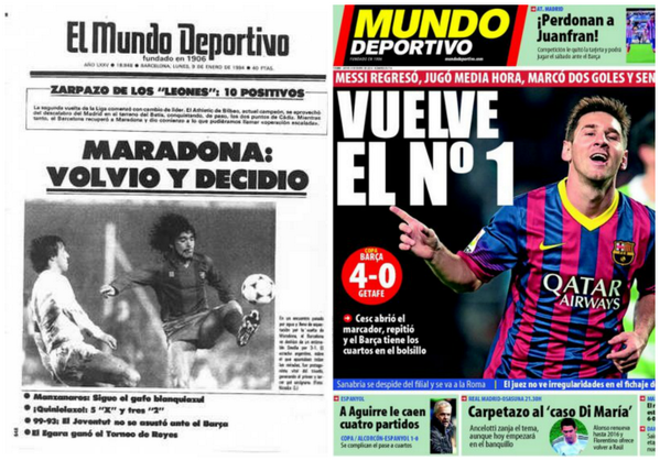 Nhưng chưa dừng lại ở đó. Cũng trước đối thủ Getafe, vào ngày 08 tháng 01 năm 2014, Messi chính thức trở lại thi đấu sau 2 tháng điều trị chấn thương. Anh ghi 2 bàn góp công vào chiến thắng 4-0 của đội nhà. Cách đó 30 năm về trước, ngày 08 tháng 01 năm 1984, cũng tại Camp Nou, Diego Maradona – trong màu áo Blaugrana tái xuất sau thời gian dài điều trị chấn thương mắt cá nghiêm trọng từng bị hậu vệ Andoni Goicoetxea của Bilbao phạm lỗi (ngày 24 tháng 9 năm 1983, phút 59 của trận đấu). Ngày đó, Maradona cùng Barça chạm trán trước Sevilla và ông cũng ghi 2 bàn làm nên chiến thắng 3-1 cho Barça.
