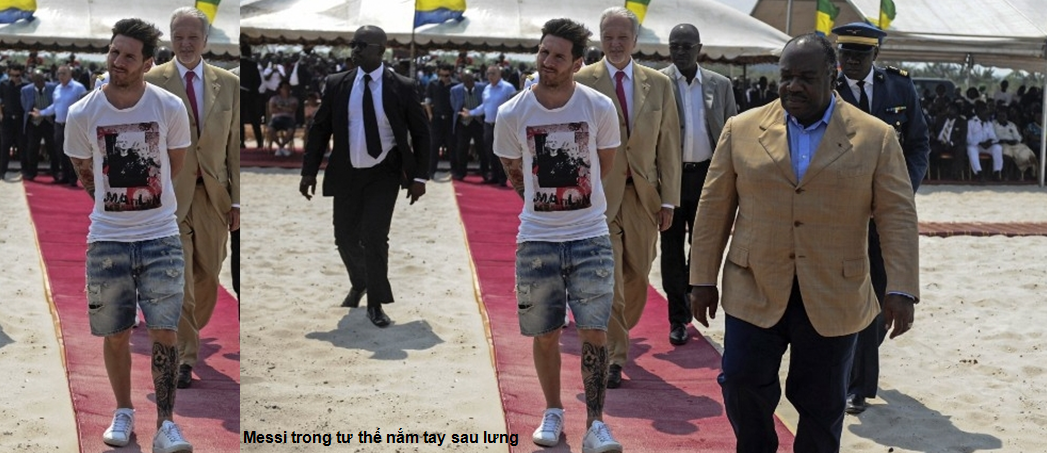 - Thể hiện rõ nhất tư thế này ở Messi là lúc cùng tổng thống Gabon trên đường tiến ra sân vận động đang được chuẩn bị xây dựng để phục vụ cho CAN Cup 2017. Để ý tấm ảnh trên, ta thấy ba trong bốn vệ sĩ đi phía sau đều quan sát rất kỹ đôi bàn tay đang nắm chặt sau lưng của Messi (nếu là một cử chỉ tích cực thì tôi chắc họ sẽ không nhìn chằm chằm như vậy đâu). Tôi không chắc vị trí tay sau lưng của Messi như thế nào, nên đưa ra cả ba trường hợp.