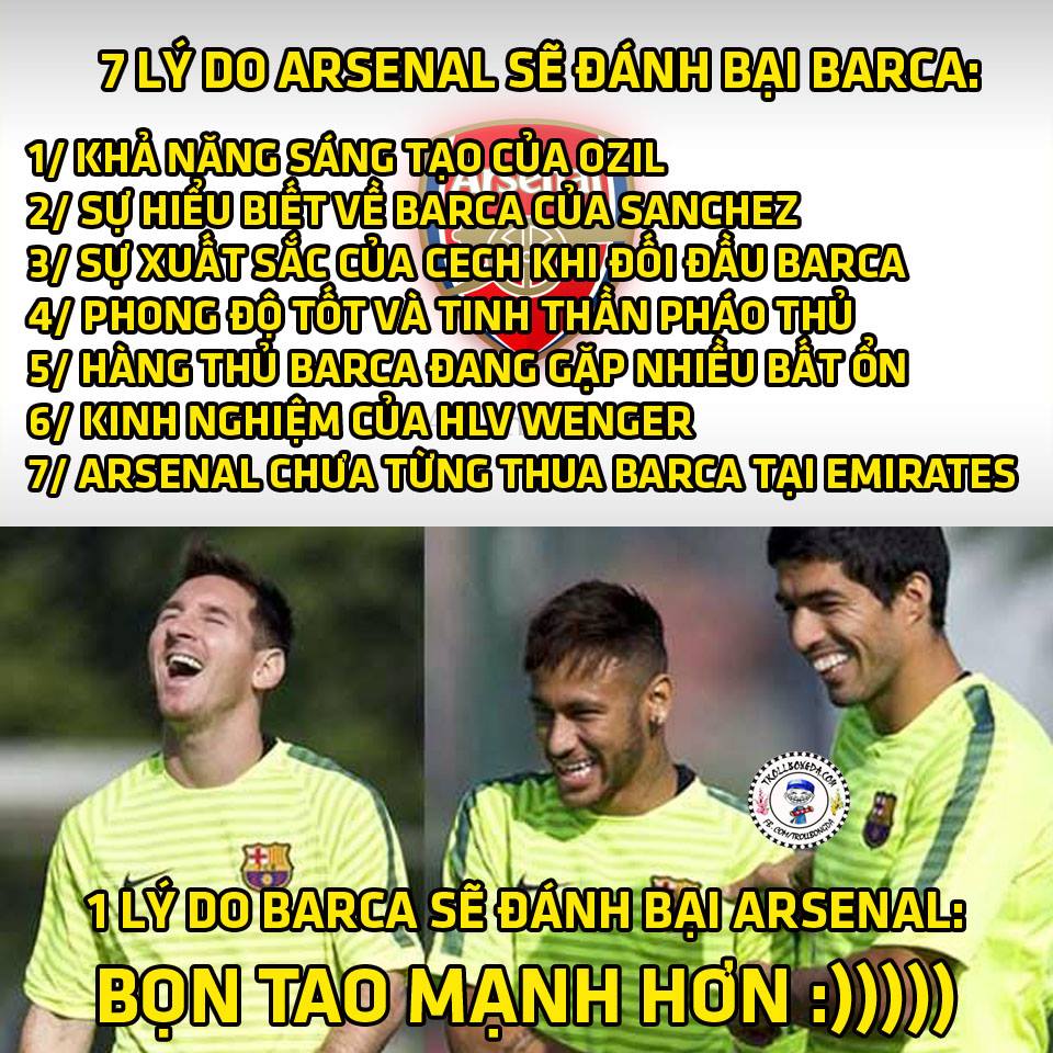 Sẵn đây nói thêm luôn. Xét về đẳng cấp, lối chơi, cầu thủ, phong độ, sự may mắn, và tâm lý thì Arsenal đều thua kém Barca ở thời điểm hiện tại. Vậy dựa vào đâu mà bạn tự tin là Arsenal sẽ làm nên chuyện? Dựa vào lợi thế sân nhà? Cái này thì càng không vì đâu phải tự nhiên mà người ta gọi Arsenal là nhà trẻ.