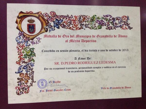 Vào hôm qua, Pedro đã được nhận Huân chương vàng cho Thành tựu thể thao từ Hội đồng thành phố Granadilla de Abona tại quê nhà Tenerife. Nói cách khác, tên tuổi của Pedro đã được lưu vào “Hall of Fame” (Nhà lưu danh) của Tenerife.