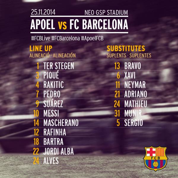 - 22 cầu thủ được HLV Enrique triệu tập đã lên đường hành quân đến Nicosia, Cyprus để chuẩn bị cho trận tái đấu với APOEL. Danh sách bao gồm: