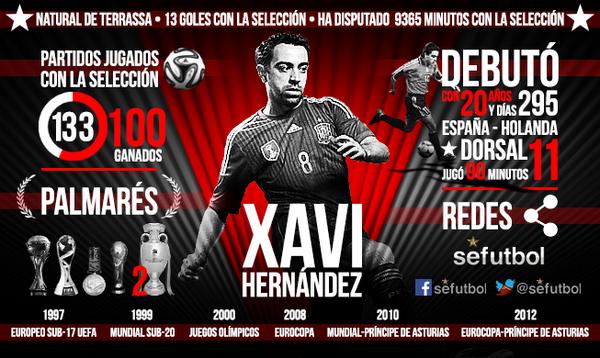 - Với 133 trận cho màu áo cho La Roja, Xavi là cầu thủ khoác áo nhiều thứ 2 sau Iker Casillas (156 trận).